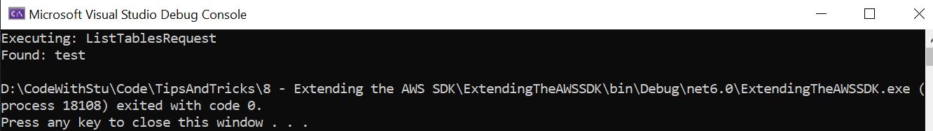 Console.WriteLine("Found: " + table);It's super important that you register your pipeline customization as early as possible so that you can capture all AWS SDK calls.